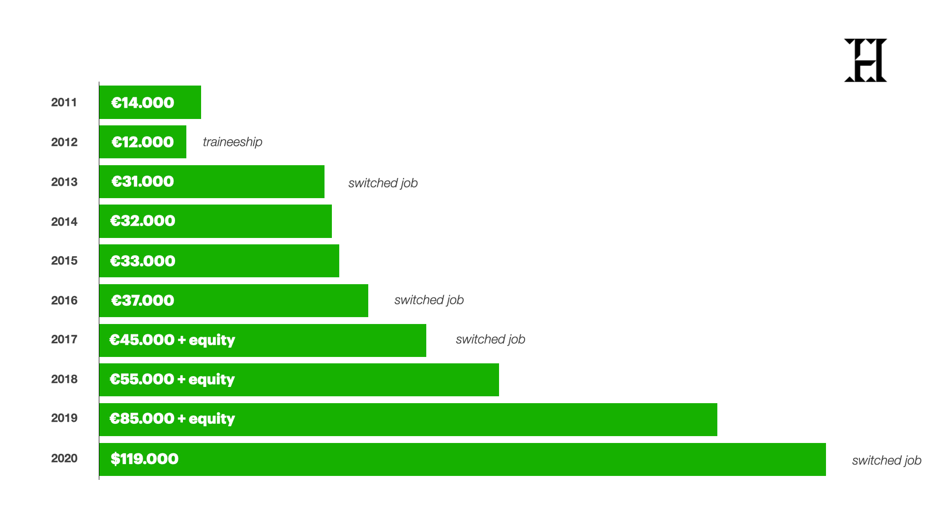 Although growing my salary from €37.000 to €45.000 felt substantial, it was completely out of line with the level of pay for that particular company. I only realised after I was there for a while that I was earning much less than almost all of my colleagues.